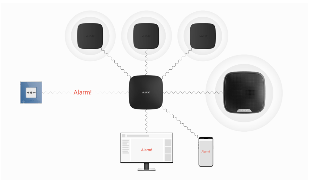 Ved at trykke på det manuelle tryk, aktiveres de indbyggede sirener i alle branddetektorer i systemet. Samtidig sendes en alarm til brugerne.