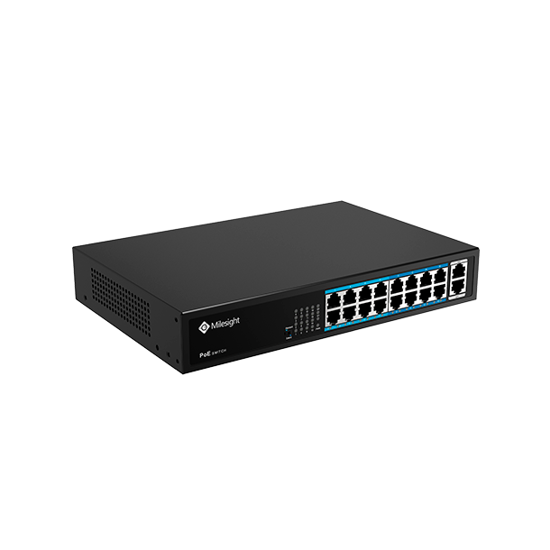 Milesight PoE Switch-serien har flere 10/100Mbps PoE-porte, der understøtter IEEE 802.3af / at-protokol og 2 uplink-porte, og giver et maksimalt strømbudget på 400 W til alle PoE-porte og 30 W for hver enkelt PoE-port, hvilket giver brugerne mulighed for at have flere forskellige konfigurerede kameravariationer.