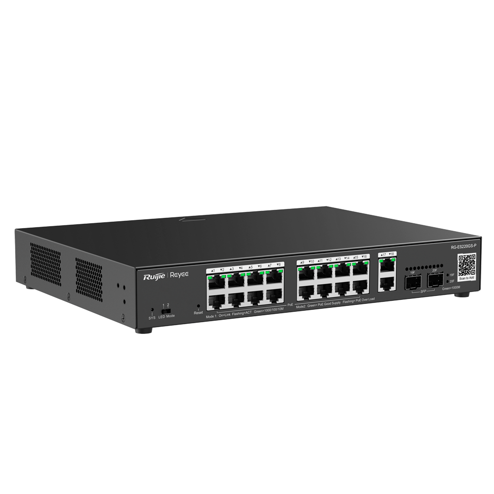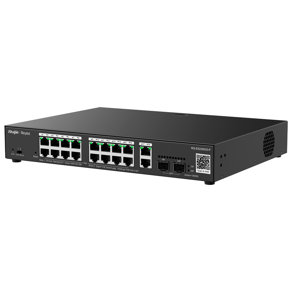 Reyee RG-ES220GS-P er en cloud-administreret 20-port Gigabit PoE+ switch, designet til små og mellemstore virksomheder samt CCTV-installationer. Med 16 PoE+-porte og en samlet effekt på 250W kombinerer den høj ydeevne med effektiv fjernstyring via Ruijie Cloud – perfekt til netværk, der kræver driftssikkerhed og nem administration.