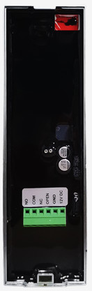 Montagen udføres på plan væg gennem skruehuller i bagpladen. Printterminaler til ledningsmontering. 12VDC med 1 relæ output.